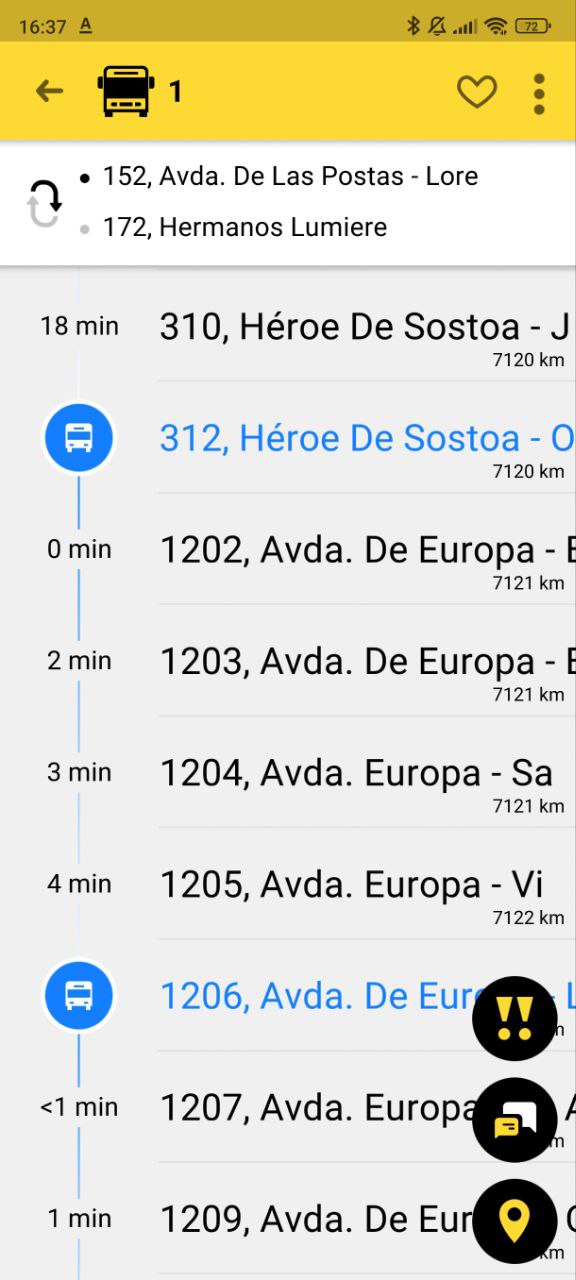 На главной странице просто нужно нажать на нужную плитку с вашим маршрутом и вам откроются два столбика с остановками направлений, на которых отмечены активные автобусы. Напротив каждой остановки есть время прибытия ближайшего автобуса.
